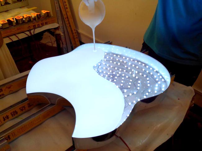 LED樹脂發(fā)光字是由外殼、填充原料、發(fā)光源三部分組成。是由調(diào)制好的樹脂倒入預(yù)先制好的模具里固化成型的,僅這個模具上,得考驗(yàn)產(chǎn)品的外觀是不是美觀和標(biāo)準(zhǔn)。并且模具成本方面不能太高以及制作方便快速。固化后脫模修整裝燈了。